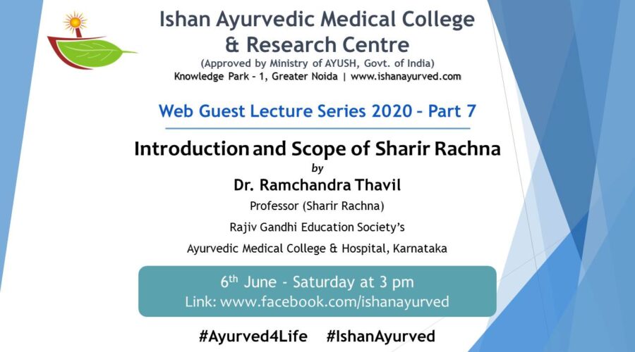 Ishan Ayurved organised a webinar on “Introduction & Scope of Rachna Sharir” The Resource person of the day was Prof. (Dr.) Ramchandra Thavil, Professor (Sharir Rachna), He spoke about the importance of Ayurveda in our Daily life and teaches fundamental concepts of Sharira. The highlighted areas are concept of srotas, avedhya sira, twak sharir, kala sharir, marma, concept of ojas, chaturvimshati purusha, sira, dhamni etcRead More